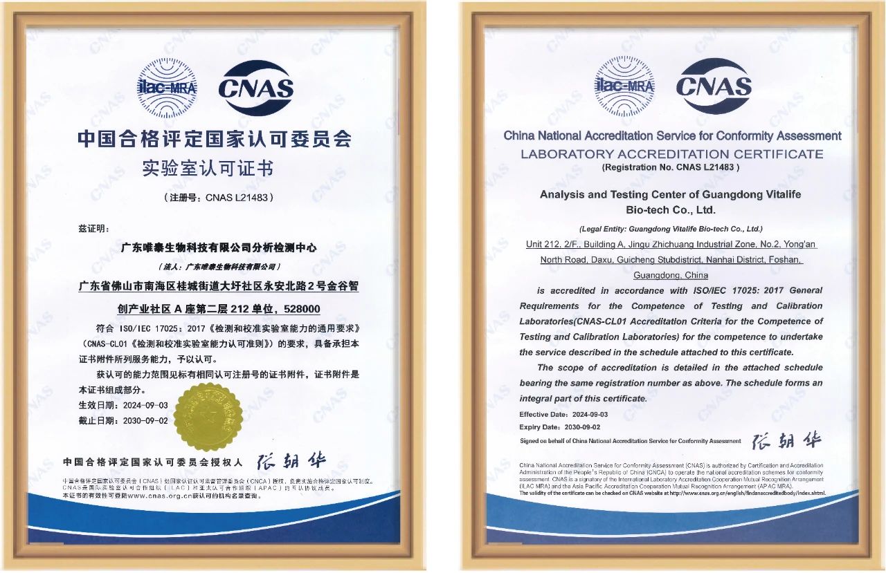 唯泰生物分析检测中心荣获中国合格评定国家认可委员会(CNAS)认可