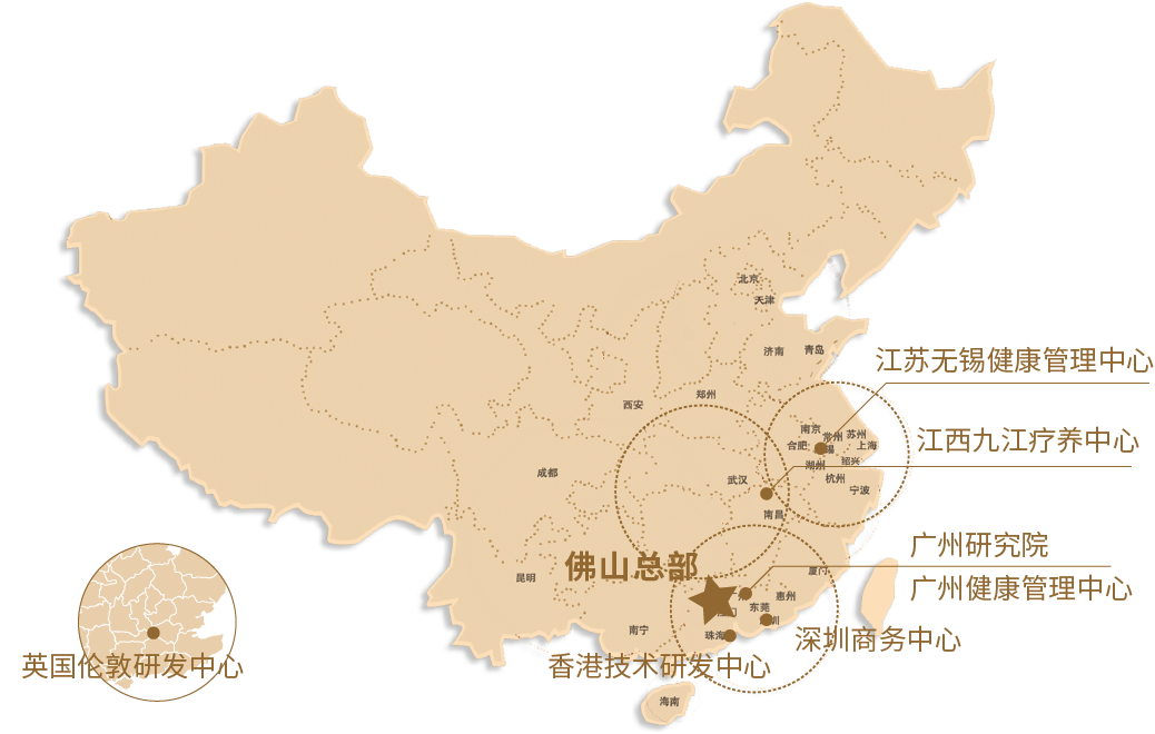 以佛山为总部,已设立英国伦敦研发中心、香港技术研发中心、深圳商务中心、广州细胞研究院、江西九江疗养中心、江苏无锡、广州健康管理中心等地分部;