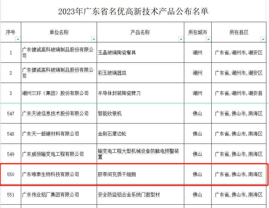 【喜讯】 唯泰生物脐带间充质干细胞获批“广东省名优高新技术产品”