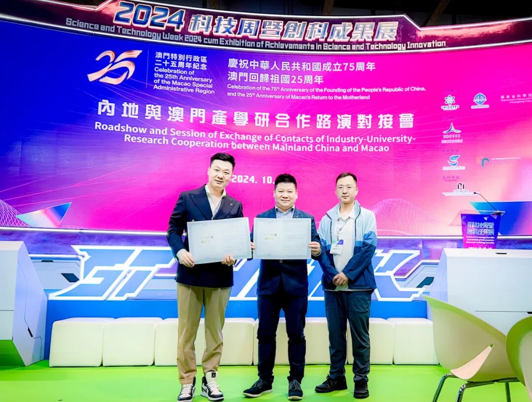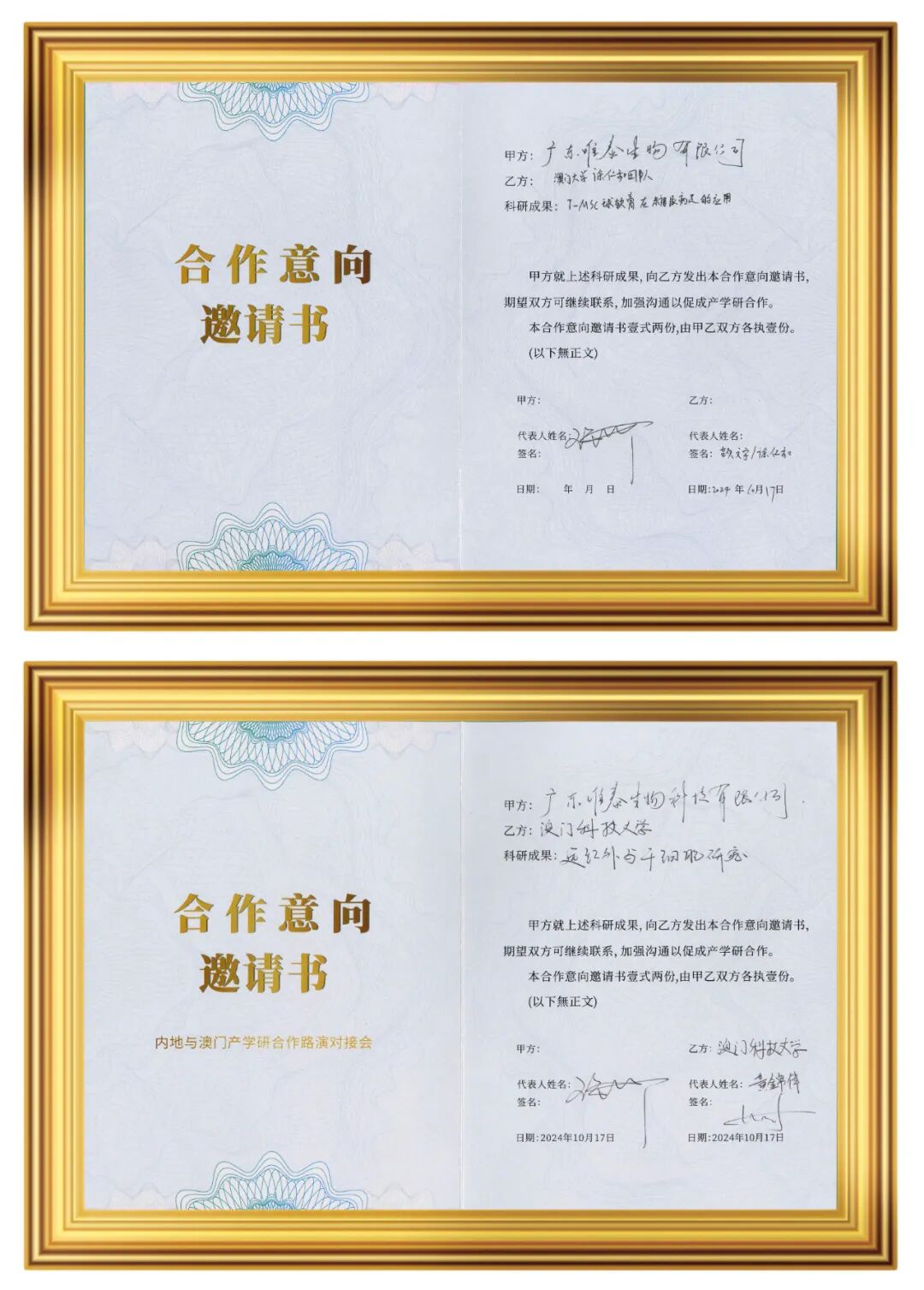 2024年10月16-18日,由澳门科学技术发展基金、中国科学技术交流中心和广东省科学技术厅联合主办的“内地与澳门产学研合作路演对接会”在澳门成功举办。本次路演对接会中,澳门方面共有17项来自澳门大学和澳门科技大学,及5项来自科技企业的创新成果参与,来自广东、江苏、湖南及四川等地70多家创新企业现场会面洽谈,并促成签订30份合作意向邀请书。其中,广东唯泰生物科技有限公司(以下简称:唯泰生物)作为佛山市科技企业代表,现场与澳门大学徐仁和教授团队和澳门科技大学黄锦伟教授团队签订了产学研合作意向邀请书。