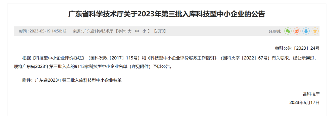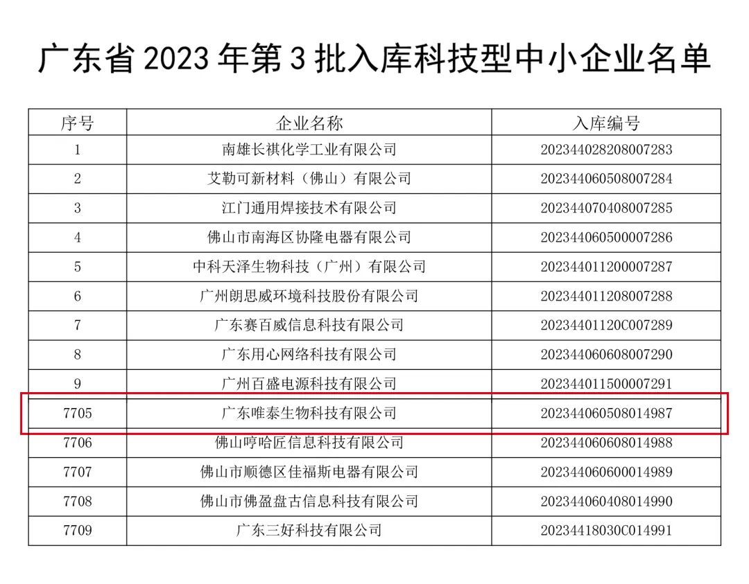 近日,据《广东省科学技术厅关于2023年第三批入库科技型中小企业的公告(粤科公告〔2023〕24号)》获悉,广东唯泰生物科技有限公司(序号:7705,入库登记编号:202344060508014987)再次成功入库2023年国家科技型中小企业名单!