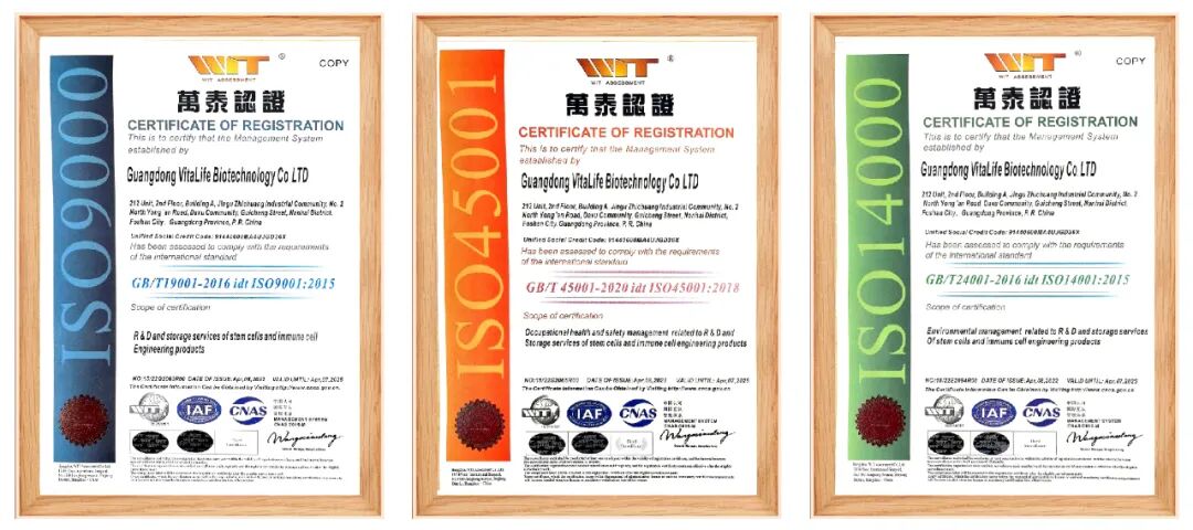 ISO三项体系认证年审的顺利通过,意味着唯泰生物在细胞安全储存、细胞的标准化制备以及技术支持服务上已建立起一套科学、严谨、安全的质量体系认证,相关产品服务及管理体系上达到国际化标准,获得权威组织认可,更是代表着唯泰生物对每一位客户的承诺和服务意识,确保每一份细胞的储存质量与临床治疗的安全性。
