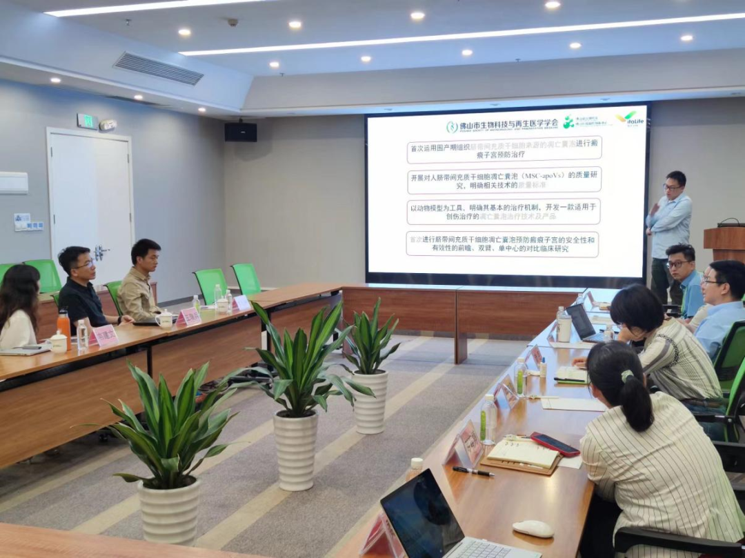 为推进再生医学领域的前沿技术创新,加强细胞应用领域的技术成果转化交流,推动生物科技与再生医学领域的研究力量整合,佛山市生物科技与再生医学学会持续开展学术交流系列活动。作为系列活动之一,5月22日上午,由澳门大学中医药国家重点实验室王瑞兵教授带队,与课题组丁元福博士、韦建文博士一行到访广东唯泰生物科技有限公司(以下简称:唯泰生物)进行技术成果交流。公司总经理王进辉、副总经理许峻荣博士、研发总监武岳博士及佛山市妇幼保健院妇产科罗欣主任等学会会员单位代表参与交流座谈,双方就各自团队最新技术创新研究成果及应用前景进行了深入的探讨与交流。