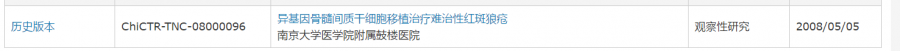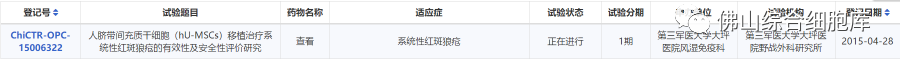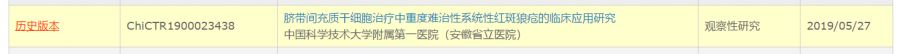 3,中国科学技术大学附属第一医院(安徽省立医院)采用脐带间充质干细胞治疗中重度难治性系统性红斑狼疮,于2019年5月27日在中国临床试验中心注册。
