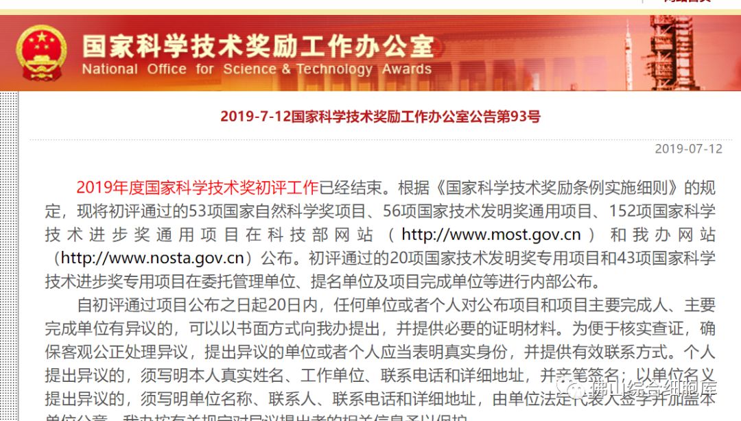 2019年7月12日,国家科学技术奖励工作办公室在科技部网站(http://www.most.gov.cn)和“国奖办”网站(http://www.nosta.gov.cn)公布了2019年度国家科学技术奖初评通过的53项国家自然科学奖项目、56项国家技术发明奖通用项目、152项国家科学技术进步奖通用项目。