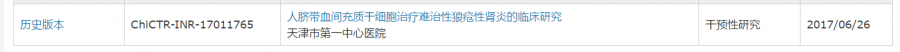 4,2017年6月26日,天津市第一中心医院在中国临床试验中心注册了“人脐带血间充质干细胞治疗难治性狼疮性肾炎的临床研究”项目。